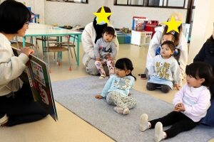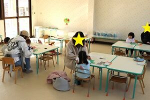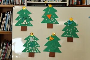 クリスマスツリーの形にシール貼りとお絵描きをしました。その後自由に遊びました。
