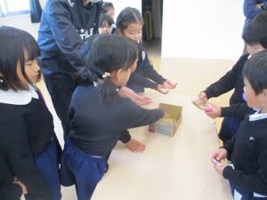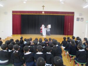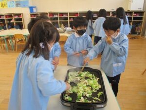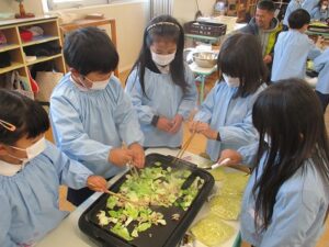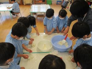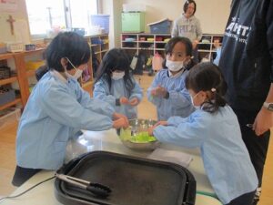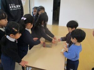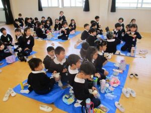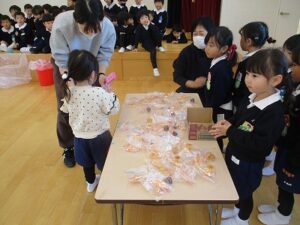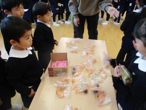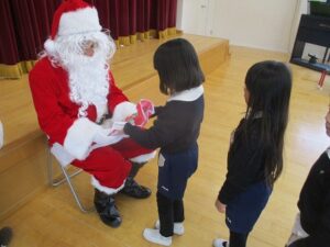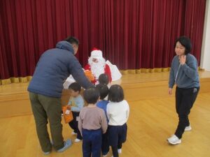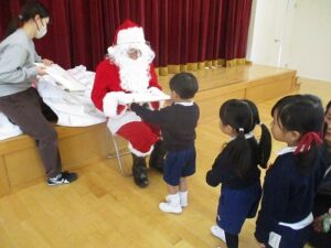 幼稚園にサンタクロースがやってきました。子どもたちもお喜び。サンタさんにプレゼントを貰いました。先生の出し物もありました。その後、年長は焼きそば、年中はおにぎりを作り、年少はお菓子を詰めてお店屋さんごっこをしました。「いらっしゃいませ~」と大きな掛け声でお客さんを呼び込んでいましたよ。おにぎりはラップに巻いてから握っています。