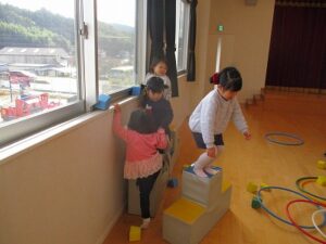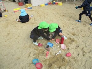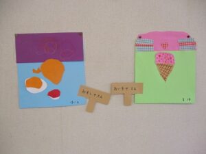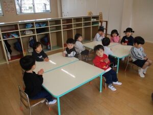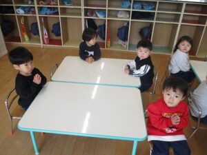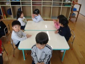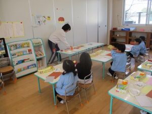 年少、年中、年長は壁面に飾るものを制作をしました。年少はケーキ、年中はお店屋さん、年長はお弁当を作りました。いちご組はホールで遊びました。その後、全員で外遊びをしました。外遊びの間に年中3名で山田屋にもちつきの買い物に行ってくれました。