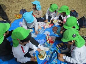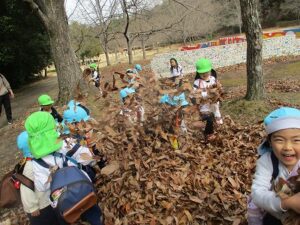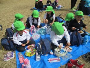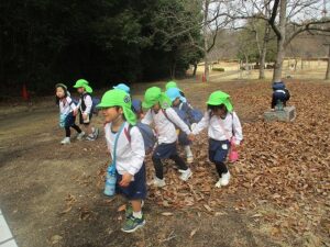 全園児で太陽ヶ丘に行って来ました。いちご組は園バスで、年少児は鴻ノ巣公園前から、年中・年長児はオレンジゴルフ前でバスを降り、歩いてふれあいの森を目指しました。お弁当を食べたりいっぱい遊んで年長さんと一緒に行く最後の園外保育。楽しかったね!