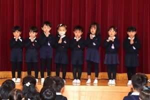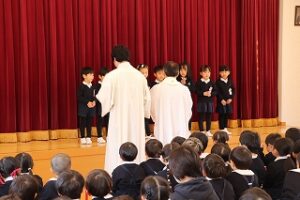 3月生まれの園児5名と2月生まれの園児3名の誕生会でした。神父様から祝福していただき、みんなからお祝いしてもらいました。先生からの出し物は「ありがとうが言えるかな?」の人形劇でした。