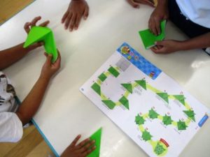 年長児が蒔いてくれた野菜が大きくなってきて、ダイコンやニンジンを間引きました。幼稚園で育てたネギとモヤシもごま油と出汁で炒めて全園児で食べました。『ラーメンみたい』と言っている子もいました。間引いたダイコンは自分で水洗いしてかじり、辛かったようでお茶を飲みながら食べていました。葉の部分も食べたいとのことでまた炒めてもらい最後の出汁まで味わっていましたよ。また野菜を食べる日が待ち遠しいですね。年長児担任