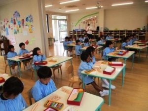 壁面制作で人間(自分)を作りました。色々な色や模様をつけて素敵な洋服を着た人がいっぱいできました。体育教室では跳び箱、英語教室では新しい英語の歌を歌ったり、「天気は何ですか?」を教えてもらいました。 年中児担任