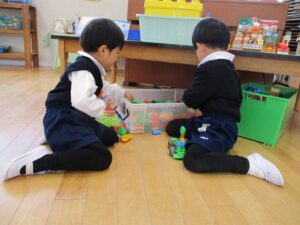 クリスマス発表会に向けて、オペレッタの練習を頑張っている子どもたち。少し恥ずかしかったり、緊張して声が小さくなる時もありますが、少ない人数ながらも一生懸命にやっています!月刊絵本では、十二支のお話が出てきて、何人かが、「僕戌年やねん」と教えてくれました。みんなに戌年と亥年の紹介もしながら楽しく絵本が見れました。 年少児担任
