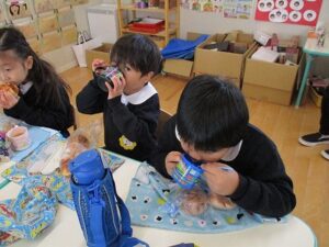 幼稚園の畑で採れた白菜と人参を使ってコンソメスープを作りました。「おいしいな~!」と言って何度もおかわりしている子もいました。 外遊びでは芋や野菜の葉っぱを使って、みそ汁を作ったりジュースを作っている子がたくさんいました。