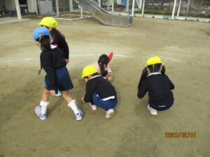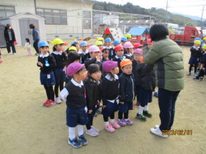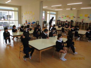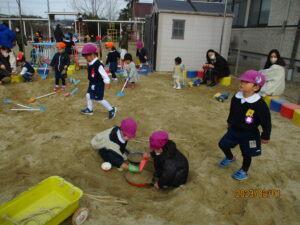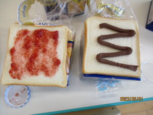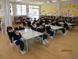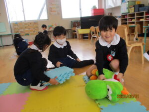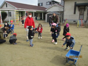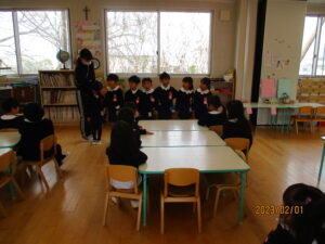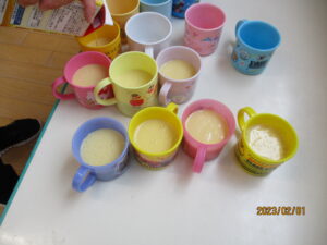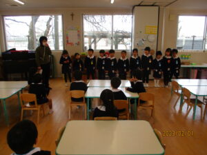 今日から年少、年中、年長、3学年での縦割り保育です。今日は各クラス自己紹介をしていました。外遊びはひよこ組が豆まきをしたので、豆を一生懸命集めて遊ぶ子どもが多かったです。今日の給食は食パンにジャム、チョコ好きなのを選んで塗ってたべました。スープも温かくて美味しかったね。節分に食べる大豆を水につけて、乾燥させて3日に炒って食べます。
