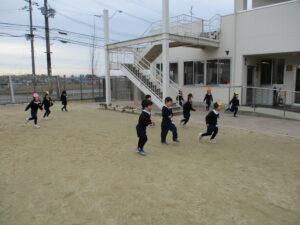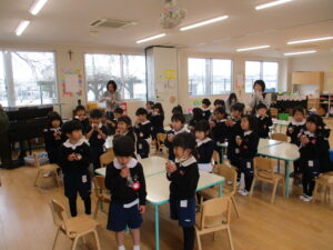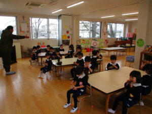 節分ということで、各学年で豆まきと恵方巻を作りました。自分で作ったお面を被り、「おには~そと!」「ふくは~うち!」と言いながら、元気に豆を投げていました。 恵方巻は、ウインナー・きゅうり・お漬物の中から入れたい具材をいれて、自分で巻いて食べました。今年の方角は南南東なので、みんなで南南東を向き黙って食べました。 外遊びでも豆まきをしたり、豆を使って遊んでいる子がいましたよ。