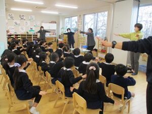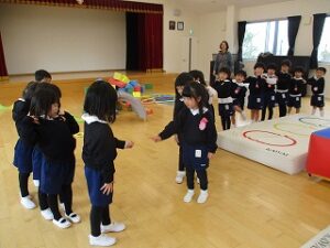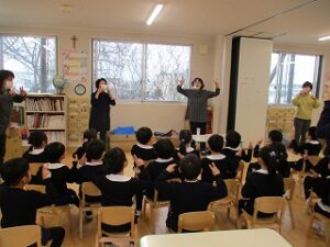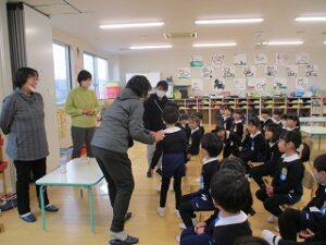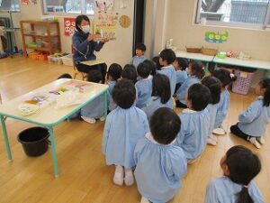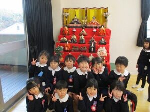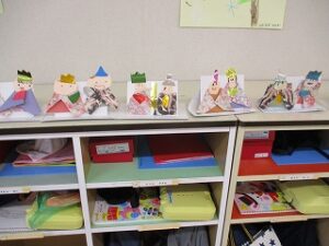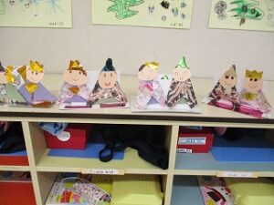 今日はあいにくの雨でした。お話を聞いて、自分たちでおひなさまを作りました。個性豊かなおひなさまが出来ました。ホールで遊んだ後、ジャンケン列車をしました。長い列車が出来て大喜びでした。年長児は手話サークルの方にいろいろな手話を教えて頂きました。