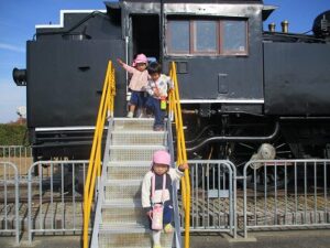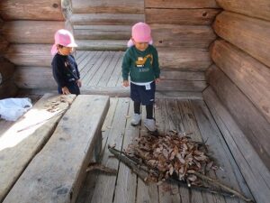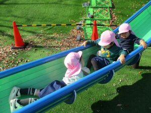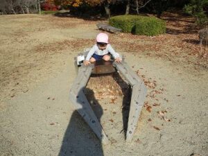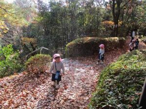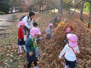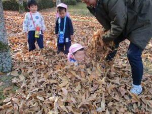 今日はいちご組で太陽が丘に行きました。落ち葉がたくさん落ちていたので、落ち葉の上に寝転がったり、シャワーみたいにかけてみたり、焼き芋ごっこをしたりしました。最後にSLの中も見れました。楽しかったね。