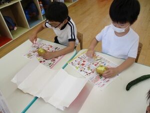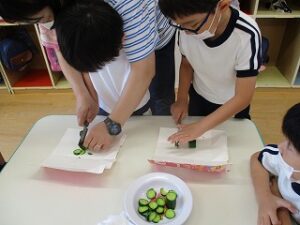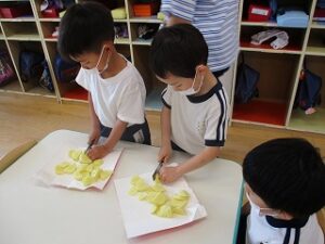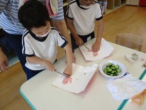 園で収穫したきゅうりを使って、ポテトサラダを作りました。4つのグループに分かれて調理開始です!野菜の皮むきから始まり、包丁で切って、茹でて、つぶして、混ぜて。いろんな工程をみんなで体験出来てよかったですね。できあがったポテトサラダは、とっても美味しかったようです!