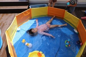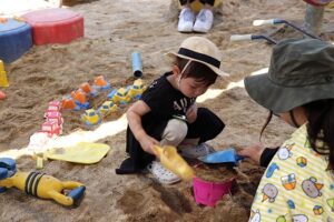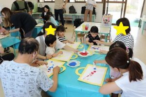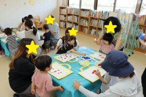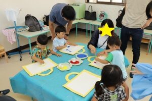 カバンの形にタンポで模様付けをしました。その後自由に遊びました。