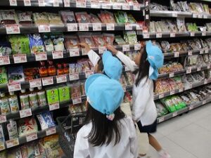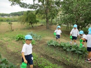 遊ぶ前、畑の野菜に水をあげながら「この野菜前より大きくなってる!」と変化に気付いたり、「こっちはまだお水が足りないかな」と水をたくさんあげてくれたり、、、 そろそろ野菜も大きくなってきたので、収穫して食べる為の材料を年長児のお友達が買いに行ってくれました。