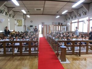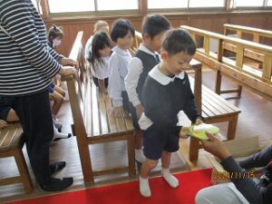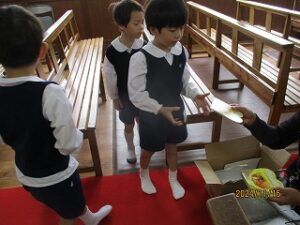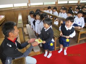 お御堂で七五三のお祝いを先生達と全園児でしました。一人ずつ絵本をプレゼントしています。時間がある時に一緒に読んであげてください。いちご組はありません。これからもみんなが元気に育ちますように、、、