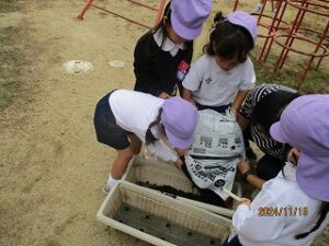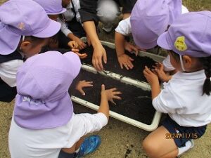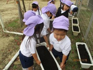 年中児がチューリップを植えるために、土をプランターに入れてくれました。今度みんなでチューリップの球根植えようね!
