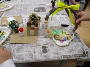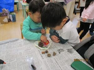 たくさんのお友達が秋の工作に来てくれました。どんぐりやまつぼっくりを使って、リースやツリーなど素敵な作品ができあがりました。
