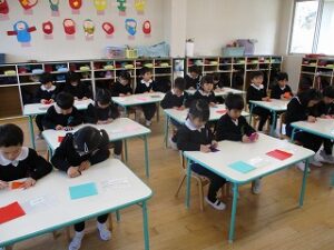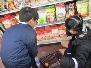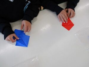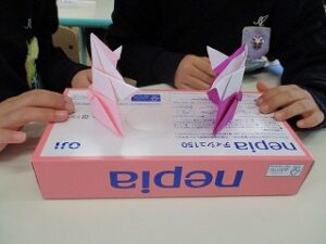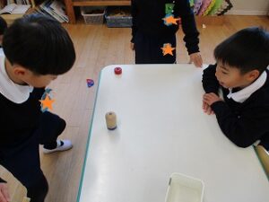 年長児は折り紙でトントン相撲を折りました。少し簡単だったようで、最後まで自分で折れる子が多かったです。そしてお友達とトントン相撲対決!「もう1回やろう!」とみんな楽しんでいました。年長児の2人がうどん作りの材料とスープ作りの材料を買いに行ってくれました。 年長児担任