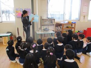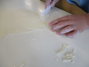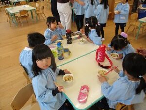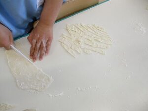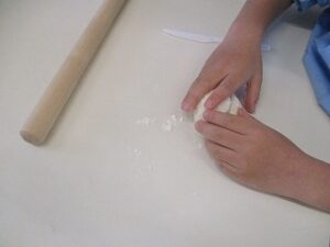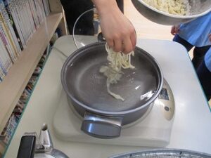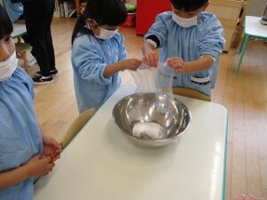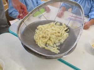 小麦粉と塩と水を混ぜて、うどんを作りました。先生たちに少し手伝ってもらいながら、混ぜる、こねる、丸める、のばす、切るの作業を子どもたちでしました!最後にうどんを茹でて、昨日作ったお出汁をかけたら完成です。お味はどうだったかな?片付けと洗い物もしてくれました。