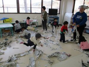 体育教室と英語教室を頑張り、お昼から外遊びをしました。いちご組は新聞遊びを楽しんでいましたよ。