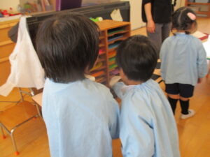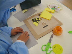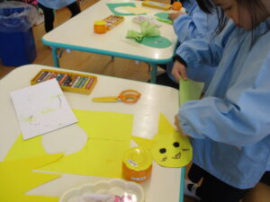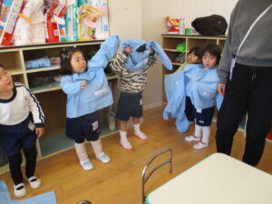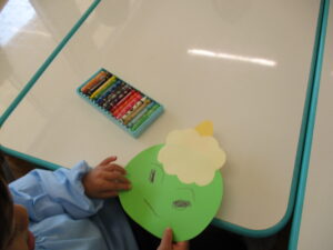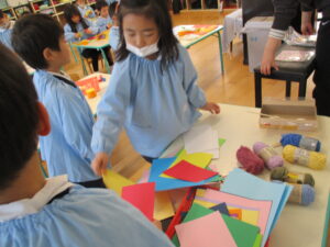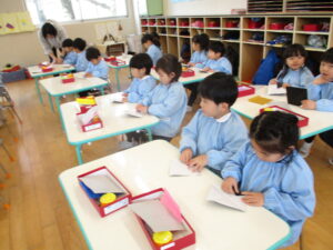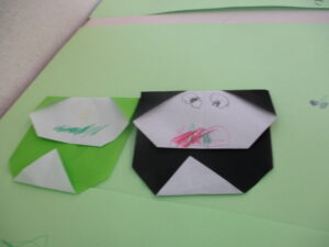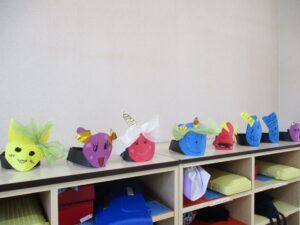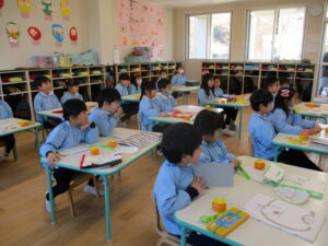 いちご組・年中・年長児は節分制作、年少児は折り紙制作をしました。各学年、制作内容や材料は違いますが、豆まきで使うお面を工夫しながら作っていました。年少児は折り方の話しを聞きながら1つひとつ丁寧に折り可愛い『パンダ』ができていました。