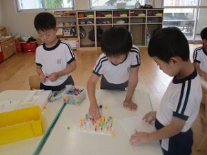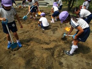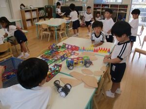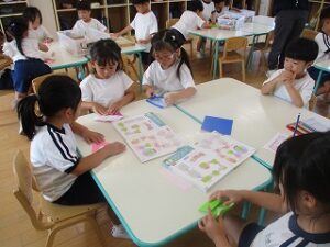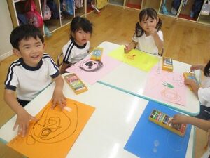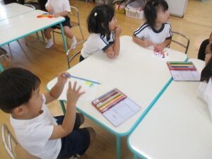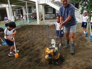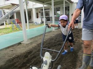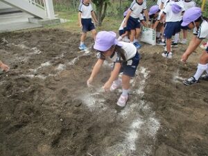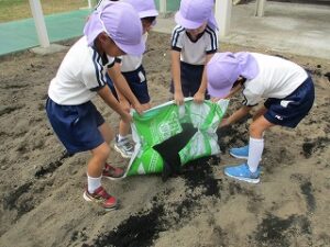 年長児は秋の野菜を植えるために、DCMへ肥料(鶏糞・牛糞)を暑い中買いに行きました。幼稚園に着き自分たちで畑まで運び、肥料を4人一組でまき、スコップや耕運機で混ぜていきました。最後に石灰をまくと、子どもたちの手は真っ白で、雪みたいと言いながら手を洗っていました。今週中に畝づくりをして来週に野菜を植える予定です。いちご組、年少・年中児は自由画を描き、少しだけ外で遊ぶことができました。