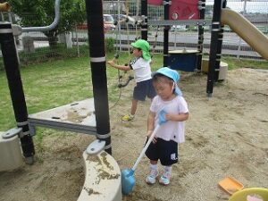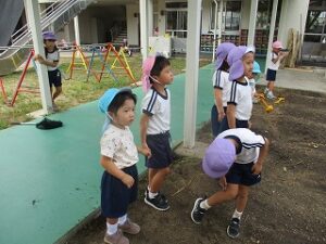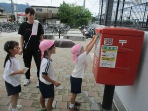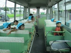 今日は久しぶりに曇り空で少し気温も下がったので、外遊びをしました。子どもたちは走り回ったり、虫探し、砂遊びなどとても嬉しそうでした。その後年中が祖父母の方へのハガキをポストに投函しに行きました。いちご組はバスで少しだけドライブに行き、消防車を見たり、アルプラザを見て「バイバーイ」と手を振っていました。かわいいですね。 いちご組担当