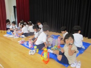 秋といえば~と子どもたちと事前にお話しをして、自分で作りたいものを決めて作りました。虫や果物などいろんな秋を感じる作品が出来ました。雨がやんでいる間に外遊びが少しでき、汗をかきながらトンボを追いかけている子もいましたよ。昼食は全学年ホールに集まってゆっくり食べました。年長児担当