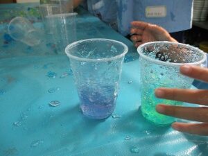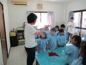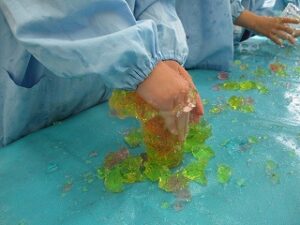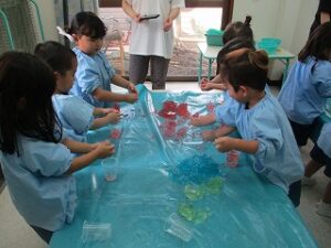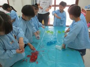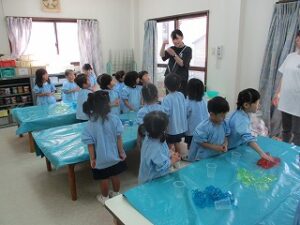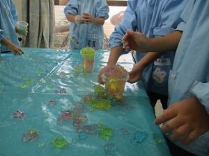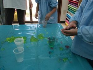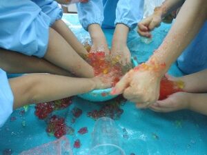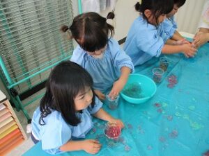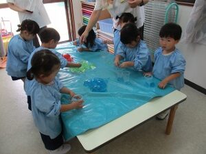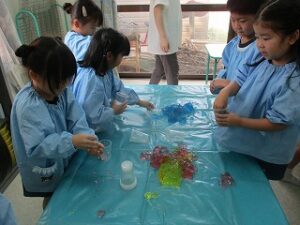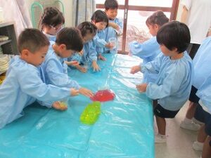 今日は全学年、交替で寒天遊びをしました。前日から牛乳パックにゼラチンと絵の具で色を付けたゼリー液を冷やして使いました。「冷たくて気持ちがいい~」「虹色になった~」いろいろな声が聞こえてきました。