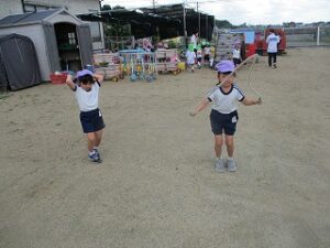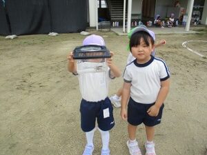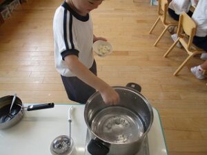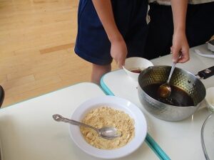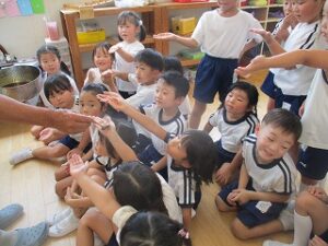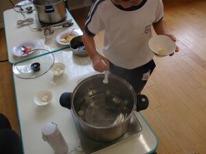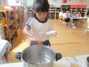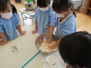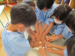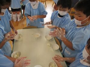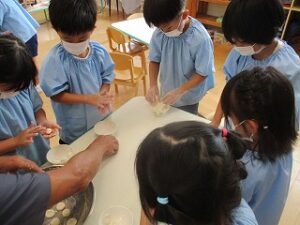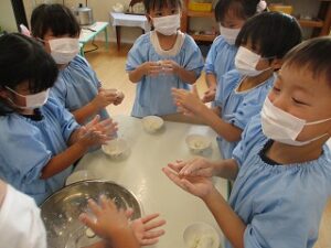 年長児は外遊びの後、白玉団子を作りました。まずは、砂糖とお醬油と水溶き片栗粉を鍋で煮立てみたらしのタレを作り、少しずつ味見をしてみました。きな粉と砂糖は混ぜておきました。次はみんなが楽しみにしている団子作りです。白玉粉とお豆腐をみんなで混ぜていき、一つの塊になったら分けて自分で丸めて、真ん中を少しへこませて完成です。お弁当を食べ終えた後、一人ずつお鍋に入れて「まだかな~」と言いながら浮いてきた団子を上手にすくい上げ、好きな味にして食べました。柔らかくて美味しい団子が出来て良かったね。年長児担当