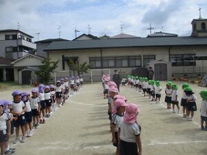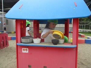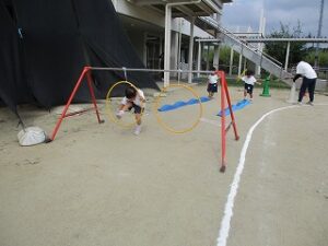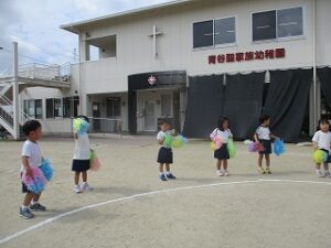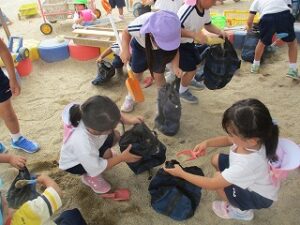 まだまだ蒸し暑いですが、運動会に向けての練習と行進の練習もしました。行進は初めてでしたが、上手に歩けていましたよ。外遊びの時にテントの重りになる砂袋に、子どもたちが砂を入れ運ぶのを手伝ってくれました。力持ちさんが沢山いて助かりました。お弁当は年少、年中、年長の部屋で好きな所を選んで食べました。