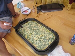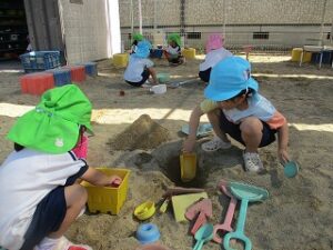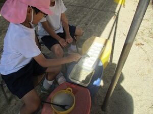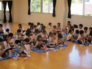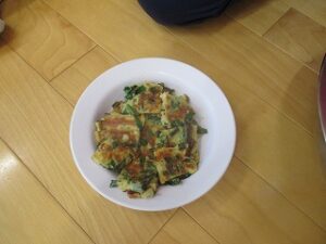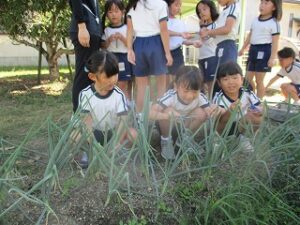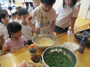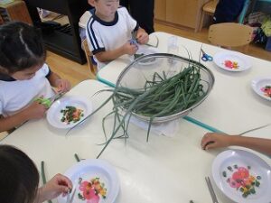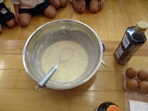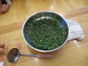 畑のねぎが伸びてきたので、年長児が収穫しハサミで細かく切ってくれました。ねぎ焼を作るために年中児4人が山田屋へ材料を買いに行ってくれ準備しました。昼食は全園児でホールに集まり、ねぎ焼きの材料やお話を聞き年長児が卵を割ったり、生地を混ぜたりしてくれました。おにぎりを食べていると焼き上がりいい匂いがしてきました。出来立てのねぎ焼きをみんなで分けて食べました。美味しかったね~今日はおにぎりの日でした。献金のご協力ありがとうございました。