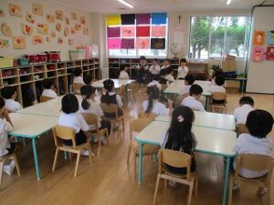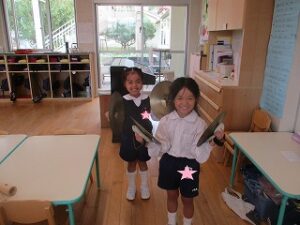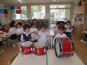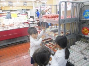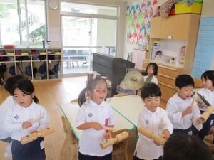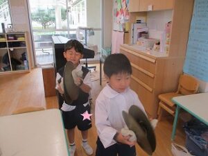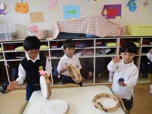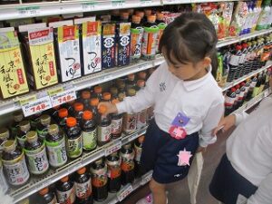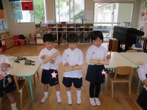 年中児はいろんな種類の楽器を楽しみました。初めて触る楽器もあったみたいで、みんな興味津々の様子でした。お気に入りの楽器を見つけている子もいましたよ!年中児4人がねぎ焼きをする材料を買いに行ってくれました。年中児担当