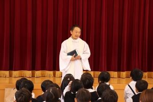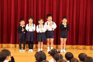 10月生まれの園児5名の誕生会でした。みんなからお祝いしてもらい、神父様に祝福して頂きました。先生からの出し物は「お母さんの誕生日」の人形劇でした。