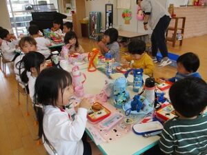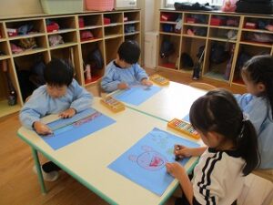 カワイ体育教室、英語教室の日でした。その後いちご組、年少児、年中児は自由画を描いて各学年で給食を食べて外遊びをしました。