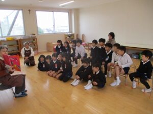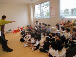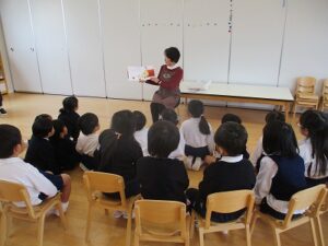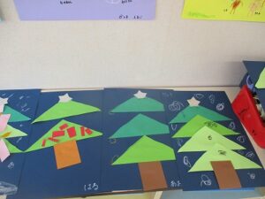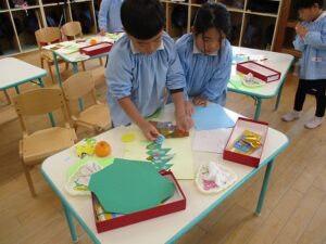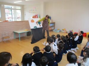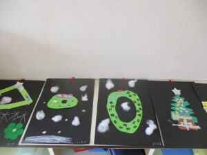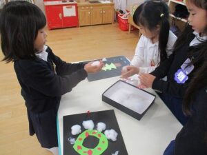 城陽お話サークルの方に来ていただき、パネルシアターや絵本の読み聞かせをしてもらいました。 その後クリスマス製作をしました。年少、年中児はクリスマスツリーを、年長児はクリスマスをテーマに作りました。自分で考えて素敵なクリスマス製作ができました。