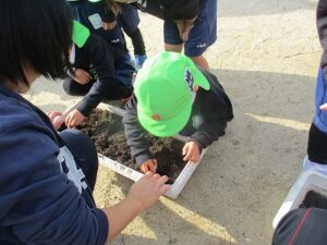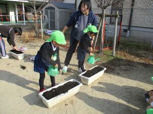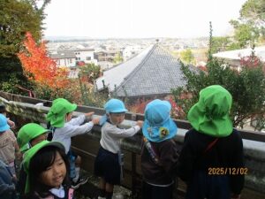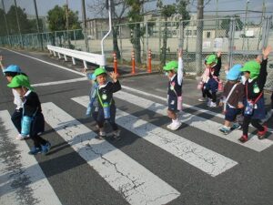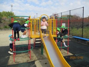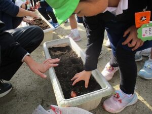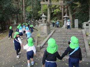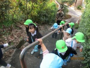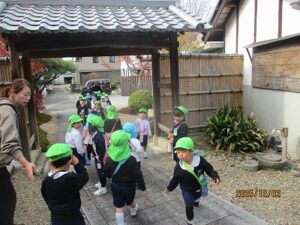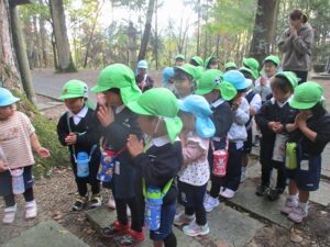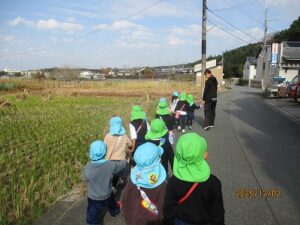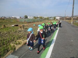 いちご組と年少組でチュウリップの球根を一人ずつ植え、青池公園をめざしてお散歩出発。歩きながら柿を見つけたり、真っ赤な紅葉を見ながら公園まで歩きました。公園ではかけっこや、遊具で遊び幼稚園まで帰って来ました。年少組のお友達はいちご組と上手に手をつないで歩けるようになったね。年少児担当