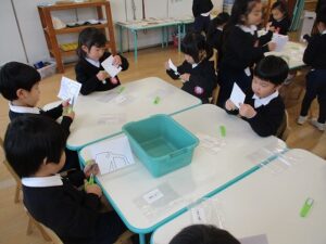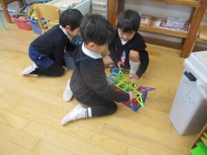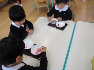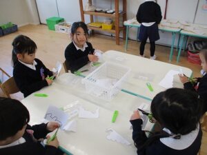 年少・年中・年長ははさみ切りをしました。年中の子どもたちも紙とはさみを上手に動かしながら、丁寧に切り進めていましたよ。室内では、カルタやこま回し、トランプなどで遊ぶ姿も見られます。年中児担当