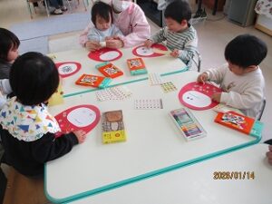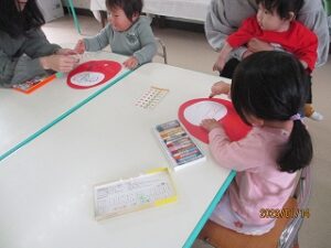 だるまの型にお絵描きとシール貼りをしました。その後自由に遊びました。