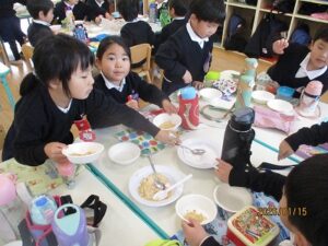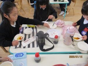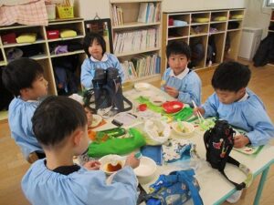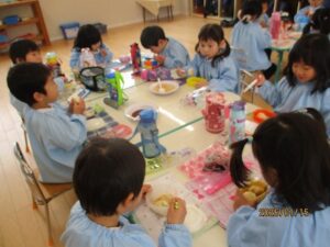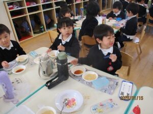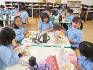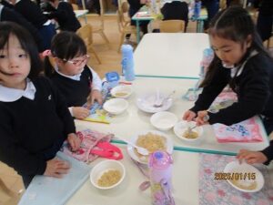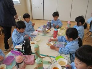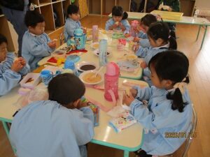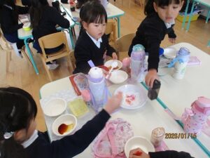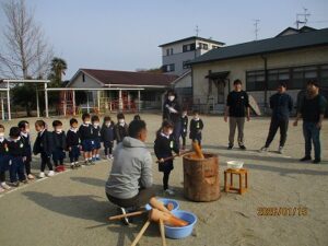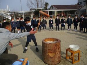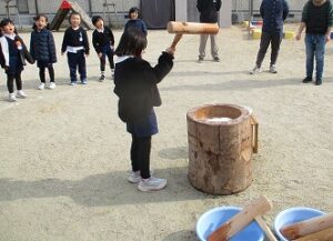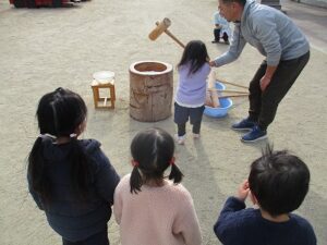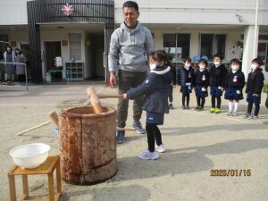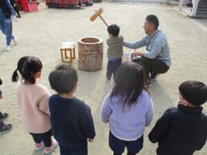 保護者の方に手伝ってもらい、もちつきをしました。年中、年長は餅つきの前に自分できな粉や砂糖醤油を作りました。自分たちで丸めて三個ずつ食べました。おかわりしていた子どももいましたよ。三個食べられなかった子どもはタッパーに入れて持ち帰ります。いちご組も小さく切ってもらったお餅を食べ、最後に餅つきもしました。