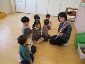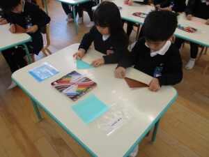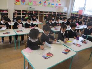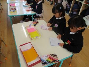 折り紙をしました。年長組は馬、年中組は家、年少組はみかんを作りました。