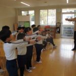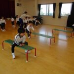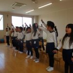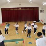 今日は体育教室と英語教室がありました。いちご組と年少組に新しいお友だちが入り、周りの子どもたちも興味津々でお話ししていましたよ。少し寒かったですが、お
