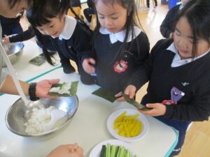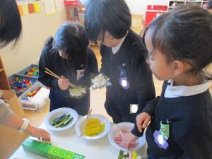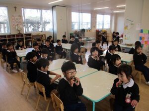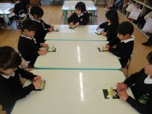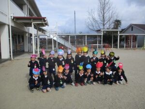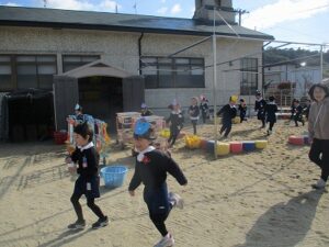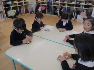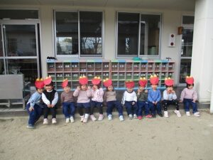 自分で作ったお面をつけて豆まきをし、恵方巻を食べました。年少児やいちご組は、鬼が怖くて隠れたり泣いている子もいましたが、「おにはそと~ふくはうち~」と言いながら、元気に豆をまいていました。 恵方巻は自分で好きな具材を入れて、今年の方角「南南東」を向いて黙って食べました。 外遊びでは、落ちている豆で豆まきをしたり、きな粉を作って遊んでいる子がたくさんいました。