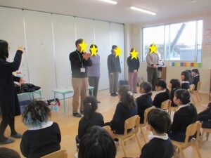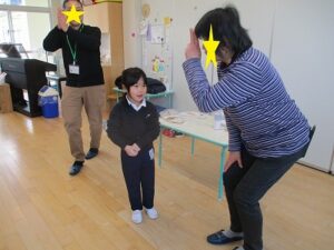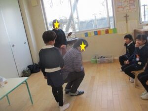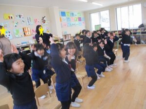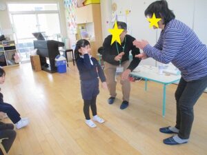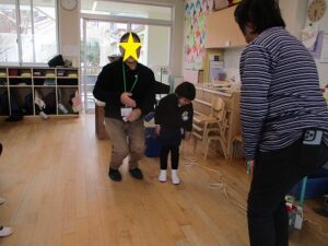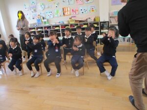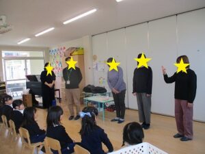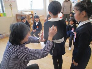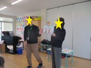 城陽手話サークルの方に来て頂き耳が聞こえない人の生活の仕方や手話での挨拶、ジェスチャーゲーム等をしました。実際に聞こえない人と交流し色んな事を感じている様子でした。年長児は指文字シールを頂いたので1人1枚持ち帰っています。年長児担当