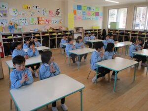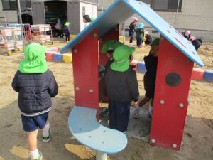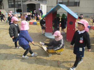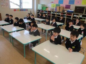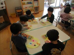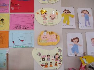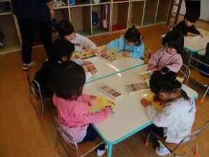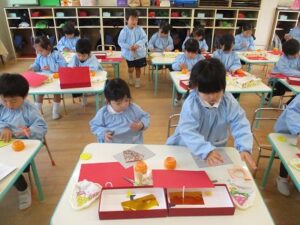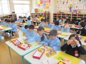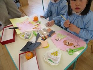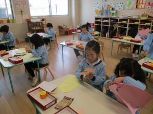 今日は全学年お雛様の製作をしました。年中、年長は自分で周りの形やお雛様を全部、自分で考えて作ってました。年少は顔と着物を自分で作って、いちご組は顔をクレパスで描きました。どの学年も、個性豊かなお雛様ができましたよ。