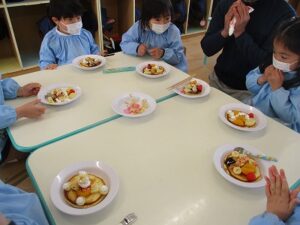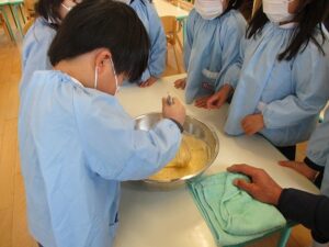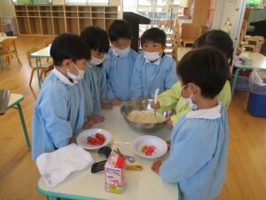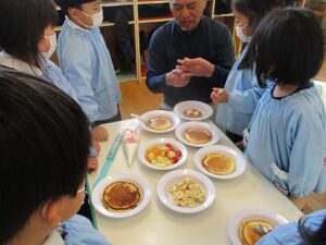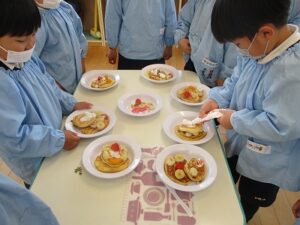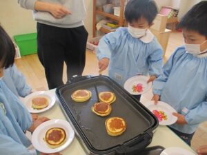 年中が4グループに分かれてパンケーキを作りました。卵を割り、牛乳を粉と混ぜ合わせて生地の完成。ホットプレートで焼いて生クリームやシロップ、果物をのせたりして自分なりに飾り付けをしました。美味しかったね。