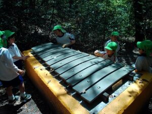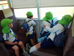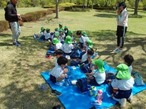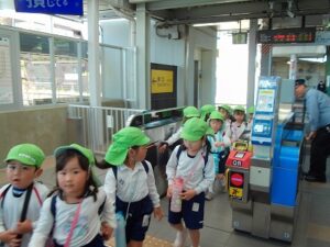 青谷駅から新田駅まで電車に乗り、歩いて太陽ヶ丘まで行きました。「まだ着かへんの?」「疲れた~」と言いながらも、みんな頑張って歩いていました。太陽ヶ丘でお弁当を食べ、遊具でたくさん遊びました。