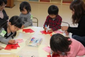 チューリップの折り紙制作をした後にチューリップの球根を植えました。入園の頃には色とりどりのチューリップの花が咲いているでしょう。