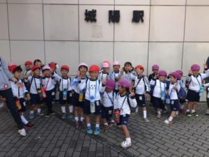 年少・年中児がJRに乗って城陽市東部コミセンまで行ってきました。交通安全の話を聞いてから園を出発しました。青谷駅からは白色電車に乗れました。「うわ~!白色や!」と喜んでいました。電車の中では静かに外を見たり、話をしているとすぐに城陽駅に到着。東部コミセンに着いて、テラスで昼食を食べました。その後少し広場で遊び、城陽駅から電車に乗って帰ってきました。電車に乗って楽しい思い出ができたかな。先生たちは少しお疲れです。