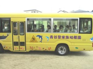 【園長より】 幼稚園に来られたお母様方と、「やっと水曜日が晴れましたね。」「今日こそ園バスに乗れますね。」「楽しみにしていました。」などとごあいさつ。水曜日のひよこ組の日に限って雨ということが続いていましたので今日は念願かなっての好天気です。二つの園バスに分かれて親子で乗っていただきました。「こっちのバスがいい!」と言ってお母さんの手を引っ張る子どももありました。可愛い園バスの中はいかがだったでしょうか?大人には窮屈だったとは思います。私は残念ながらお留守番で、手を振って見送りました。