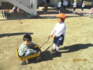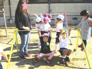 今週は天気には恵まれないのかと思っていましたが、今日までずっと秋晴れです! 今日もひよこ組の子どもたちが笑顔で集まってきました。可愛い楽器(マラカス)を作り、『おもちゃのチャチャチャ』に合わせて演奏しました。外遊びの時は、在園児の子どもたちが、小さなお友だちと遊んであげる姿も見られました。