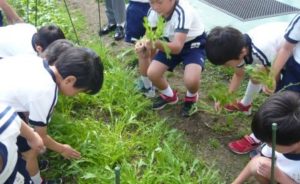 畑の水菜が育ったので年長児が収穫をし、各学年で食べました。もりもり食べている子もいれば、少し苦いと言っている子もいました。他の野菜もすくすくと育ってきています。